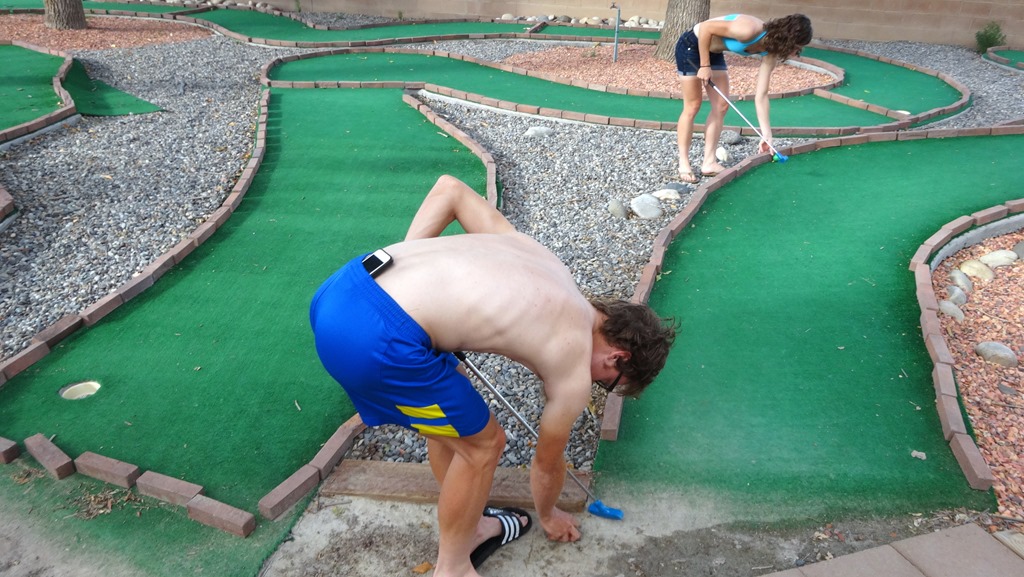 After the Friday night entertainment, we had very little to keep ourselves occupied with on Saturday. The 40 mile race consisted of one big loop, so there was no chance we could head out and pre-ride the whole thing. Instead we settled with hitting the parts we’d been warned about. My previous experience of riding around here had told me to be wary of what was on offer, and I was proved right. Rocky, hot, dusty and exposed. The singletrack clung to the edges of meandering canyons; seemingly endless diversions into gullies, and multiple points where you could swear you’d taken a wrong turn. After 2 hours of baking ourselves in the sun, and a quick detour across some private land to avoid a long slog home, we settled back into our KOA campsite exhausted and concerned for what was on tap the next day. We’d averaged 6 mph for our little section of riding, and suddenly the estimation of how long the race may take went up and up. To releive our worry, we settled into a relaxing game of minigolf. It was warm.